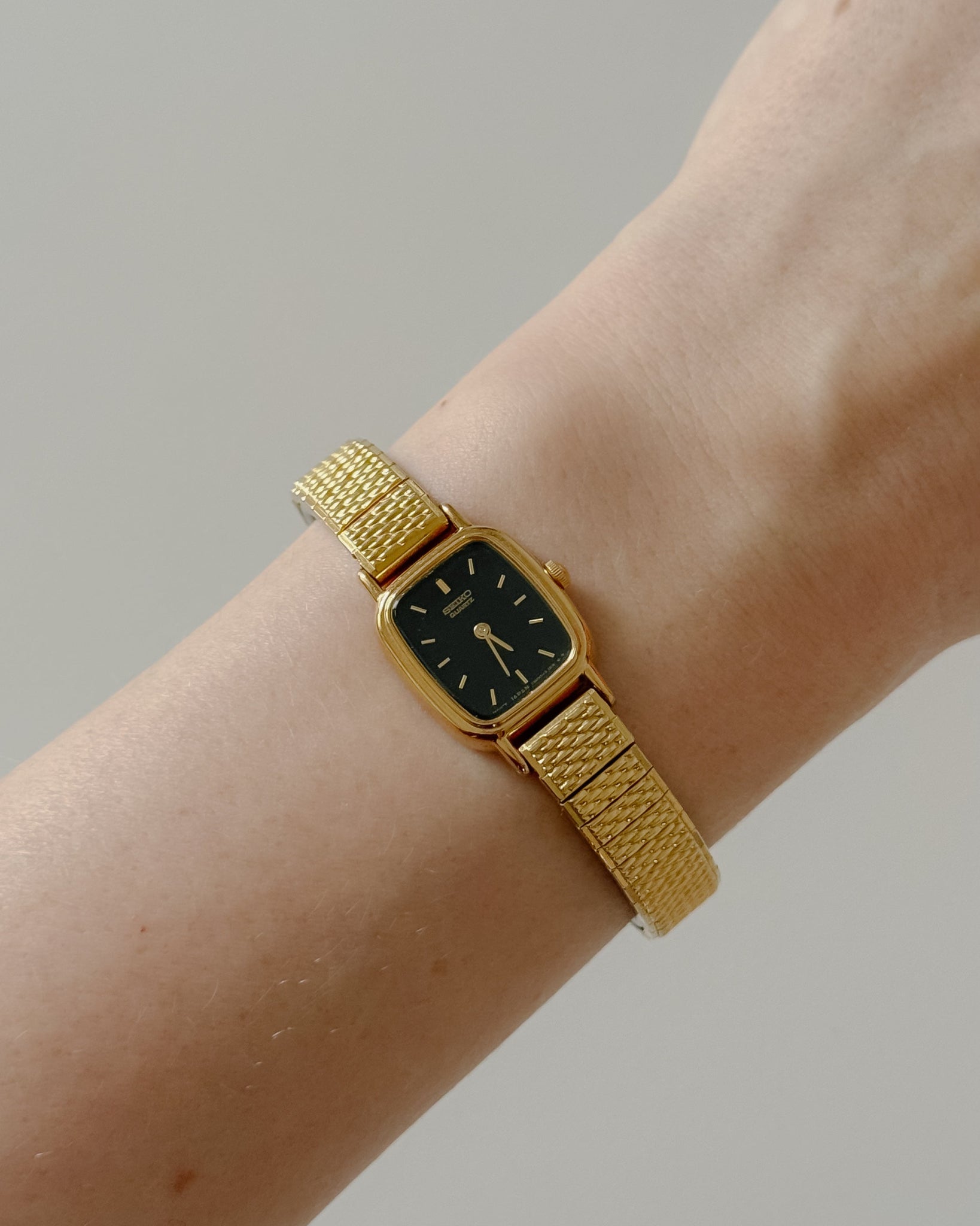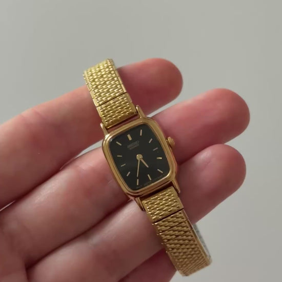 Zegarek Seiko, pozłacany. W idealnym stanie. Pasek wykonany jest w formie bransoletki na gumce. Długość paska razem z tarczą wynosi 16 cm. W pełni sprawny, zegarek działa. Stan 10/10