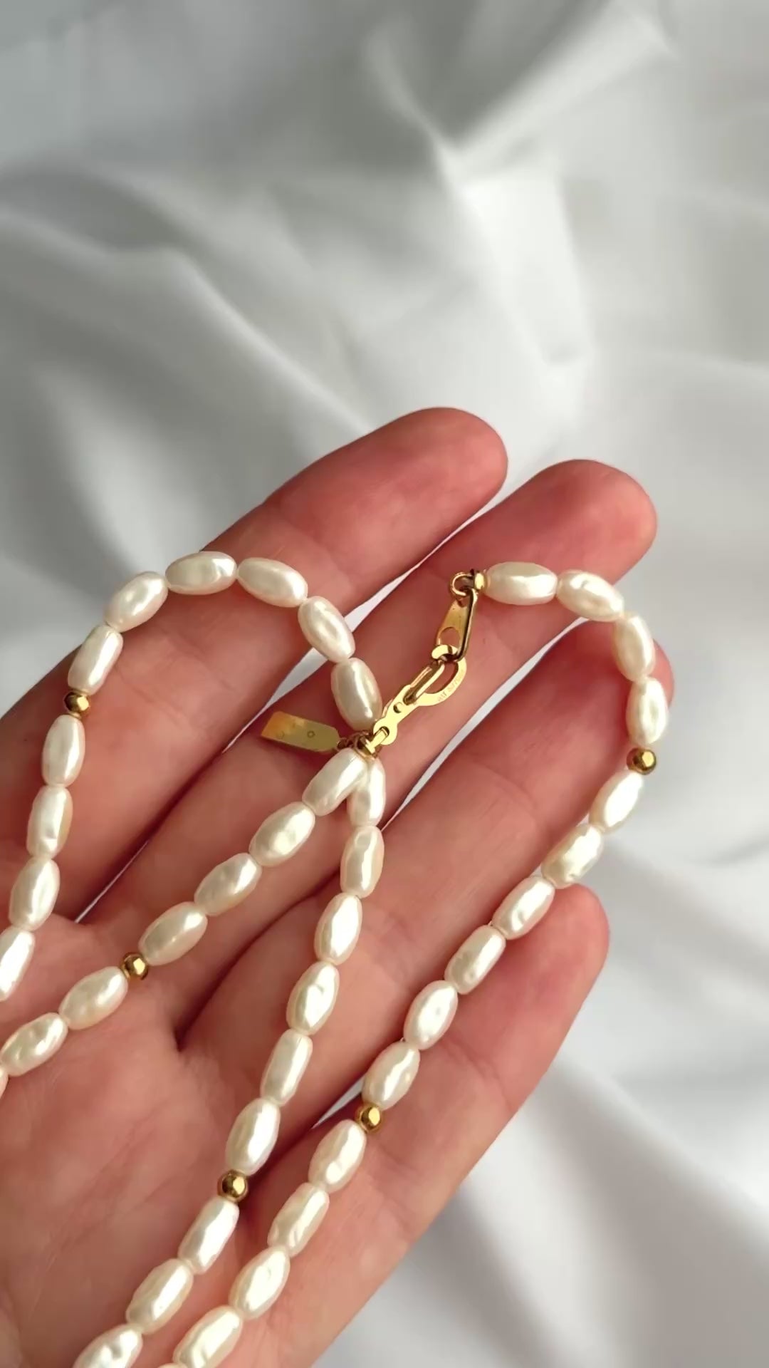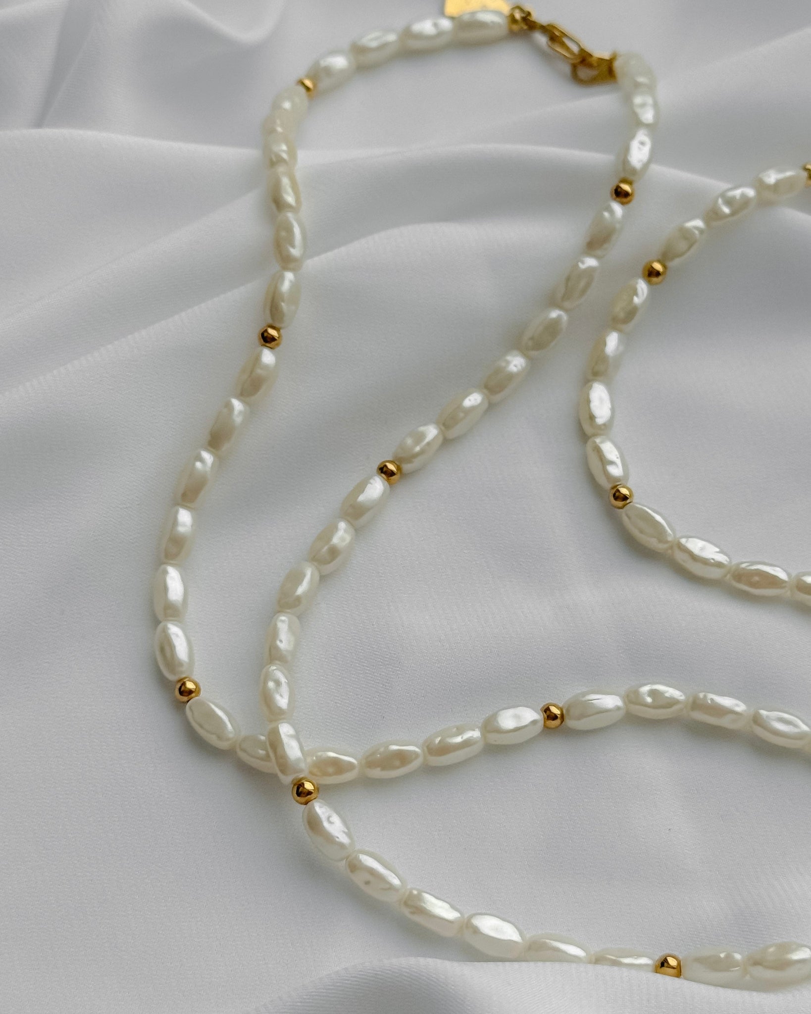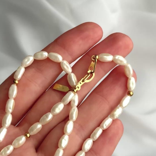 W bardzo dobrym stanie. Sztuczne perły, ale wyglądają jak prawdziwe. Będą się świetnie prezentować w połączeniu ze złotymi łańcuszkami lub naszyjnikiem. Długość: naszyjnik 46 cm.