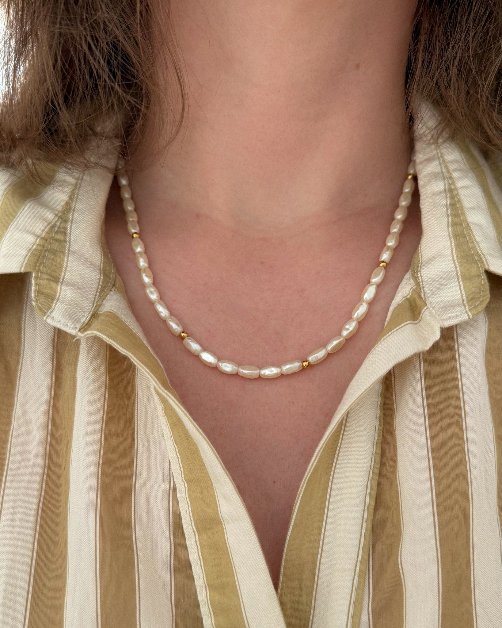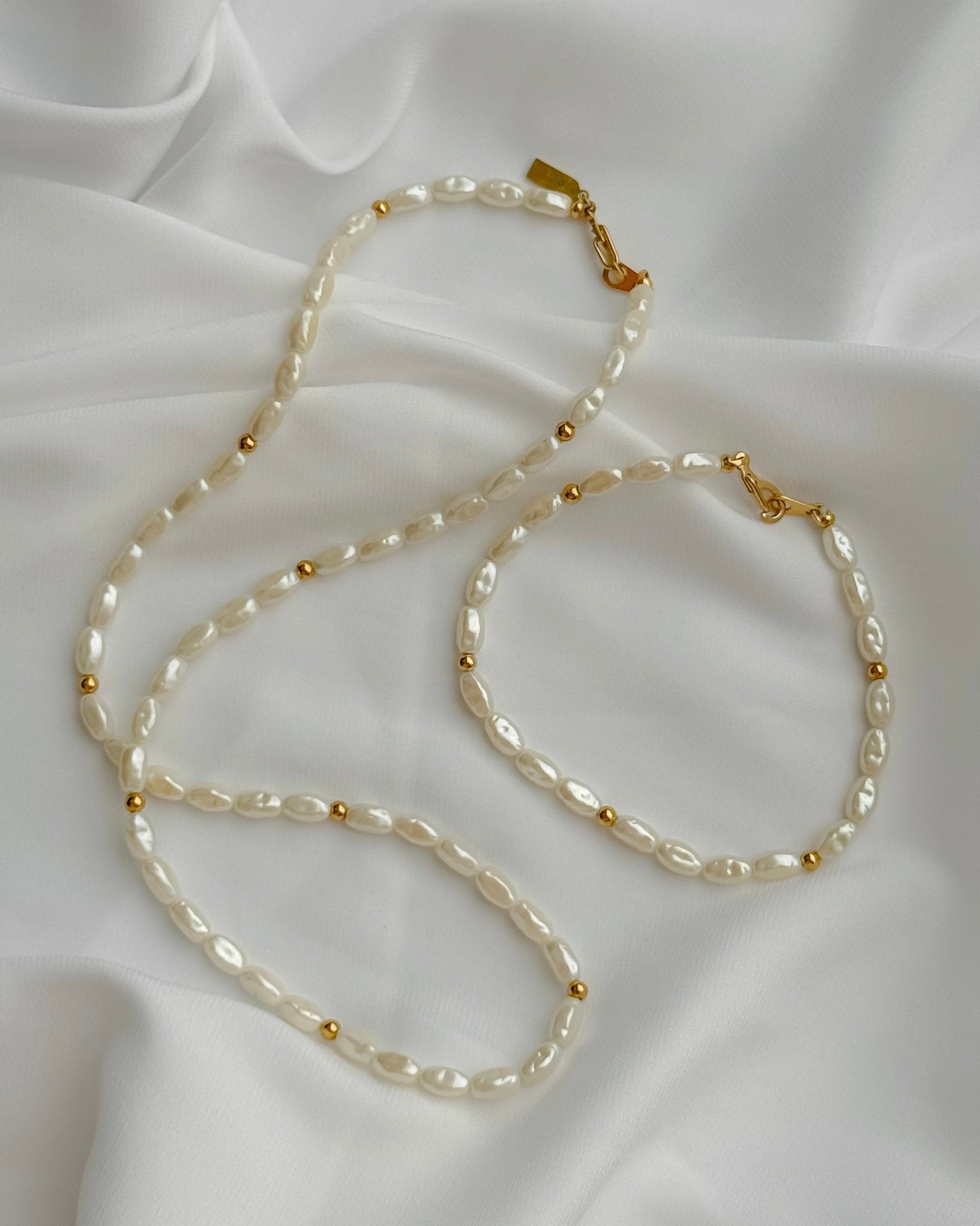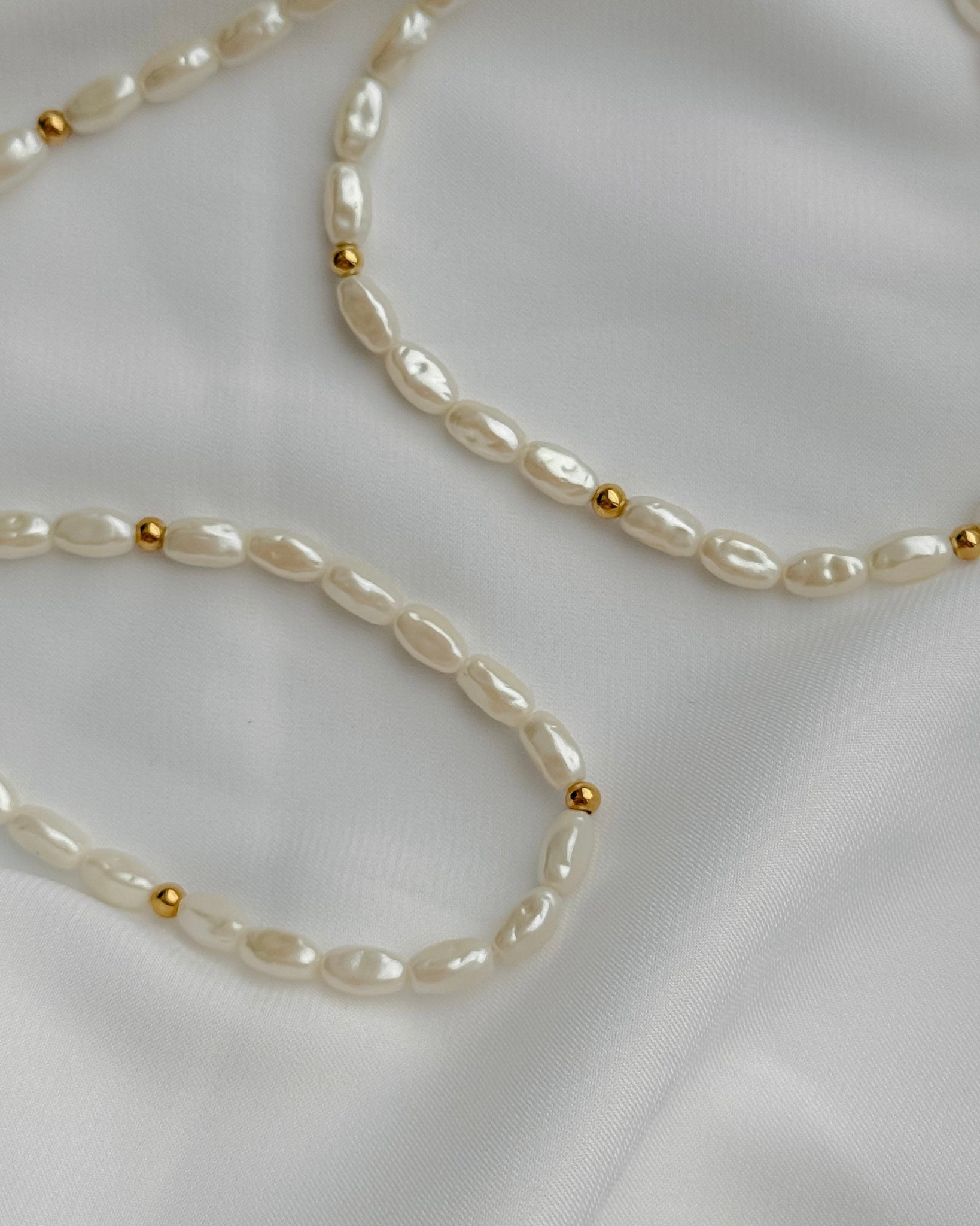 W bardzo dobrym stanie. Sztuczne perły, ale wyglądają jak prawdziwe. Będą się świetnie prezentować w połączeniu ze złotymi łańcuszkami lub naszyjnikiem. Długość: naszyjnik 46 cm.